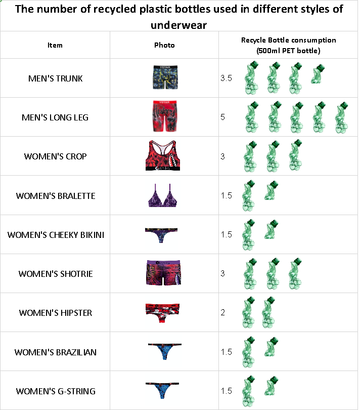 עבור תחתונים, פחות מ-6 יחידות בקבוקי PET של 500 מ"ל יכולים ליצור בד תחתונים, בבקשה עיין בפרטי מידע תחתונים בייצור ההמוני שלנו.